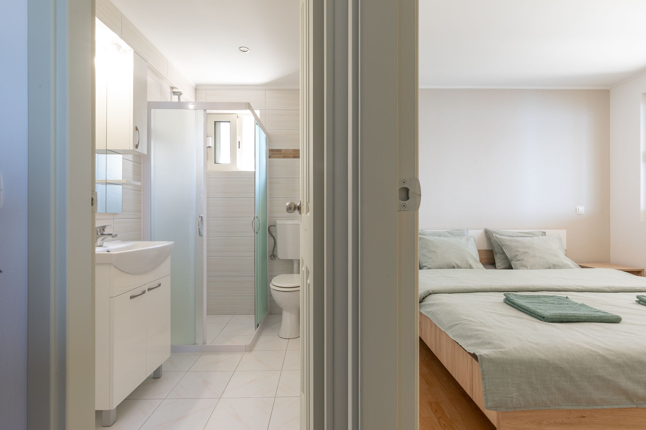 The top floor is 110 m²: two bedrooms, two bathrooms, large living room-kitchen-dining room, huge 25 m² terrace with beautiful panoramic view.
