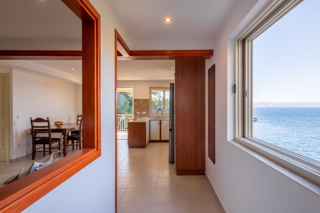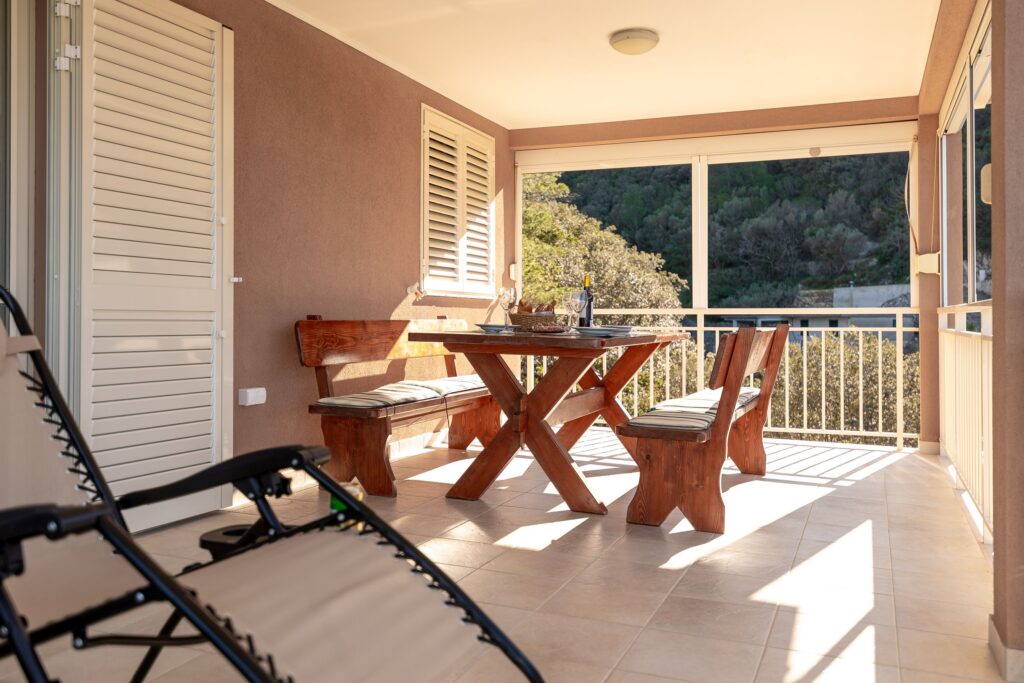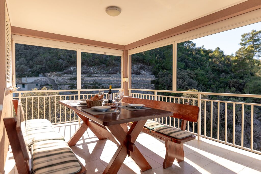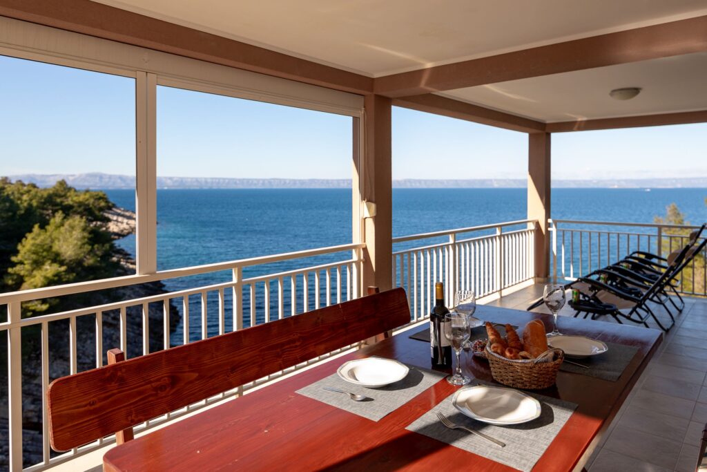 The terraces overlook the bay, open water, the island of Hvar with the mountains of the mainland in the background.